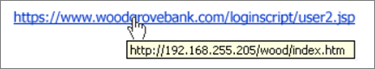 - Are the links or URLs not pointing to the expected location? – Many malicious emails include links that at first glance seem legitimate but take you to a separate website. If you hover your mouse over the link before clicking, you’ll be able to see where the link will direct you. In the following example the link looks like it’s taking you to “https://www.woodgrovebank.com” but it is pointing to 192.168.255.205/wood.index.htm